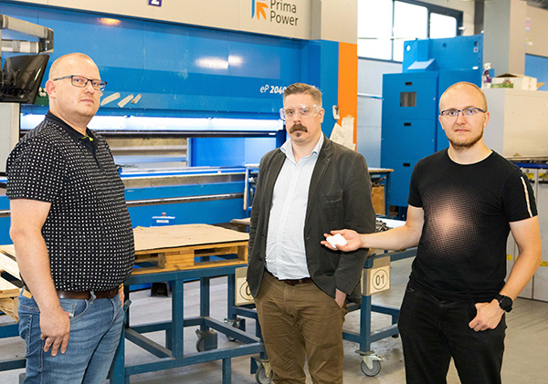 Kuvassa vasemmalta Reiferin tuotantopäällikkö Kyösti Särkkä sekä kehitysjohtaja Mikko Lampi ja ohjelmistoarkkitehti Jari Nykänen Metatavulta tarkastelevat IoT-sensoreiden toimintaa Reiferin tuotantotiloissa.