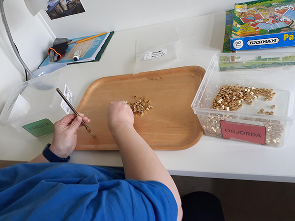 ”Alihankintatyöt ovat parhaita työtehtäviä. Työ harjoittaa hienomotoriikkaa, ja työskentelyn ja muun päivätoiminnan ansiosta myös aivot voivat hyvin”, sanoo Siv Gustavsson, joka osallistuu Solbackenin yksikön työelämäorientoituneeseen toimintaan.